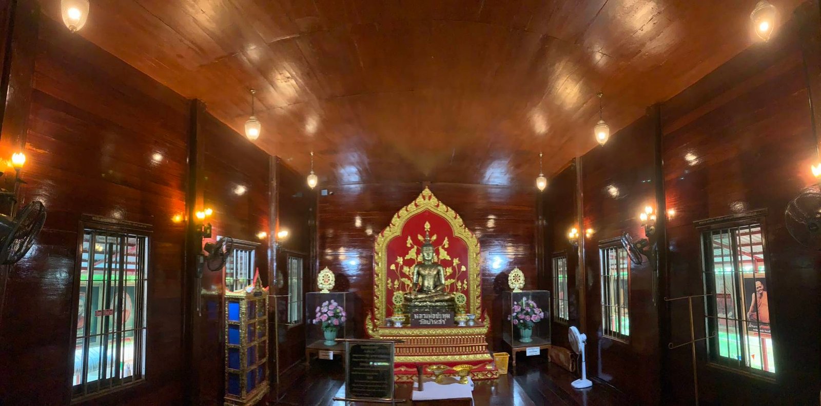 พระอุโบสถ ต้องการแสงสว่างที่ขจรขจาย. โคมไฟแขวนเพิ่มความสง่างามให้กับพระประธานและจิตรกรรม.