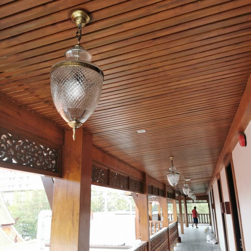 ชั้นที่สองคือไฟบรรยากาศจากโคมแขวนและโคมพื้นเมือง แสงที่นุ่มจะช่วยให้ผนังกับพื้นไม้ดูอบอุ่นขึ้น และทำให้ลวดลายงานไทยเด่นแบบไม่แข็ง หากต้องการคำแนะนำเรื่องขนาดและตำแหน่งติดตั้งในพื้นที่จริง สามารถดูแนวทางได้ที่ โคมไฟวัดและงานไทย ซึ่งอธิบายเรื่องระยะติดตั้งและรูปแบบที่เหมาะกับเพดานแต่ละแบบ